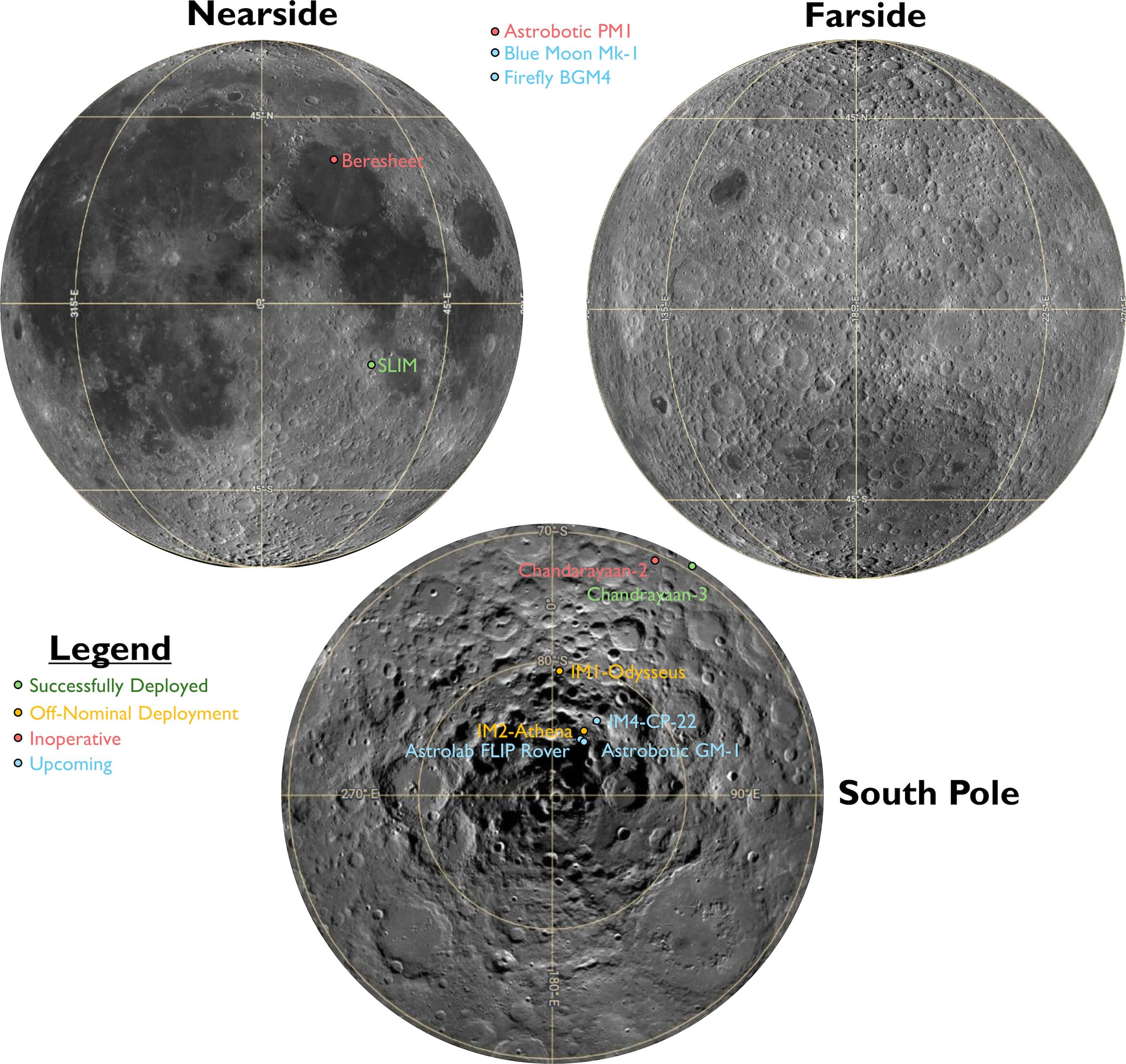 4 | SLIM (JAXA) | September 6, 2023 | Off-Nominal Deployment | 13.31549°S, 25.24889°E | Yes |