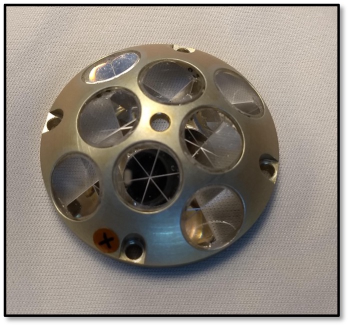The NASA GSFC mini-LRAs are small, passive devices which require no power, commanding, data downlink, or thermal control. They are hemispherical in shape, with a diameter of 5.11 cm (2.01 inches), a height of 1.65 cm (0.65 inches), and a mass of 20 g (0.71 ounces). Each mini-LRA contains eight corner cube retroreflector (CCR) prisms which operate via total internal reflection and each with an acceptance angle of 17 degrees. The eight CCRs are arranged in two concentric rings; the first ring is at 20 degrees from zenith and the second at 40 degrees. This enables the array to have an overall acceptance angle of any azimuth angle and at elevations above 30 degrees from the mounting plane. Below is an image of the one of the mini-LRAs prior to thermal vacuum testing at NASA GSFC.