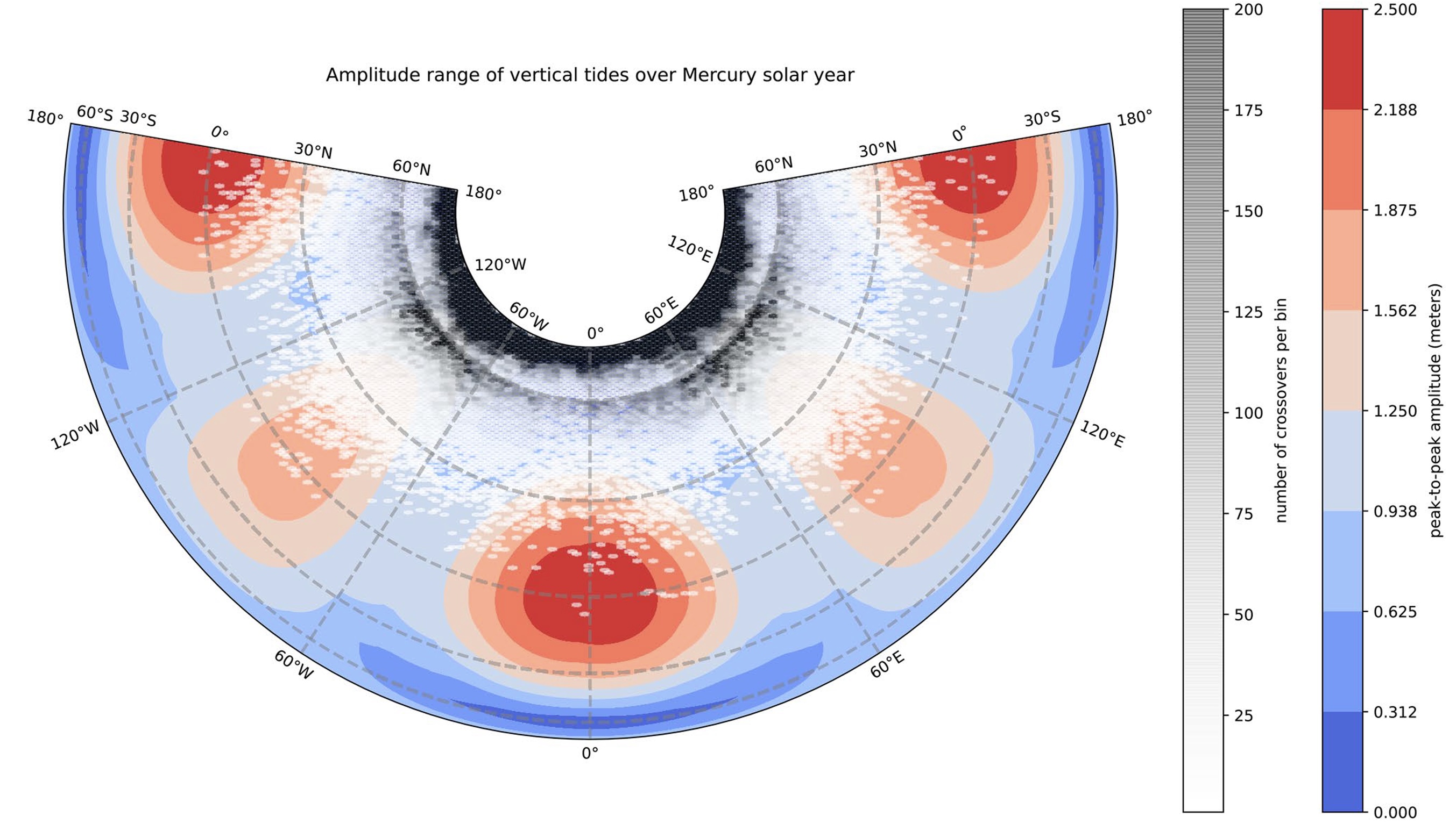 Figure 1. Geographic distribution of MLA crossovers superposed on expected Mercury tidal deformation patterns, illustrating why the vertical Love number h2 is difficult but still measurable from altimetric crossovers.