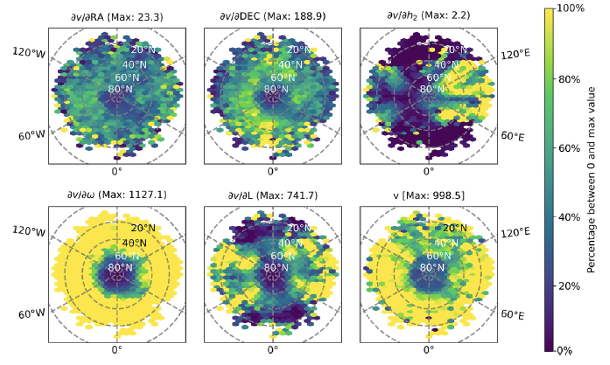 Figure 2. North-polar stereographic view of MLA crossover sensitivity to Mercury rotational and tidal parameters, together with the geographic distribution of pre-fit crossover discrepancies.