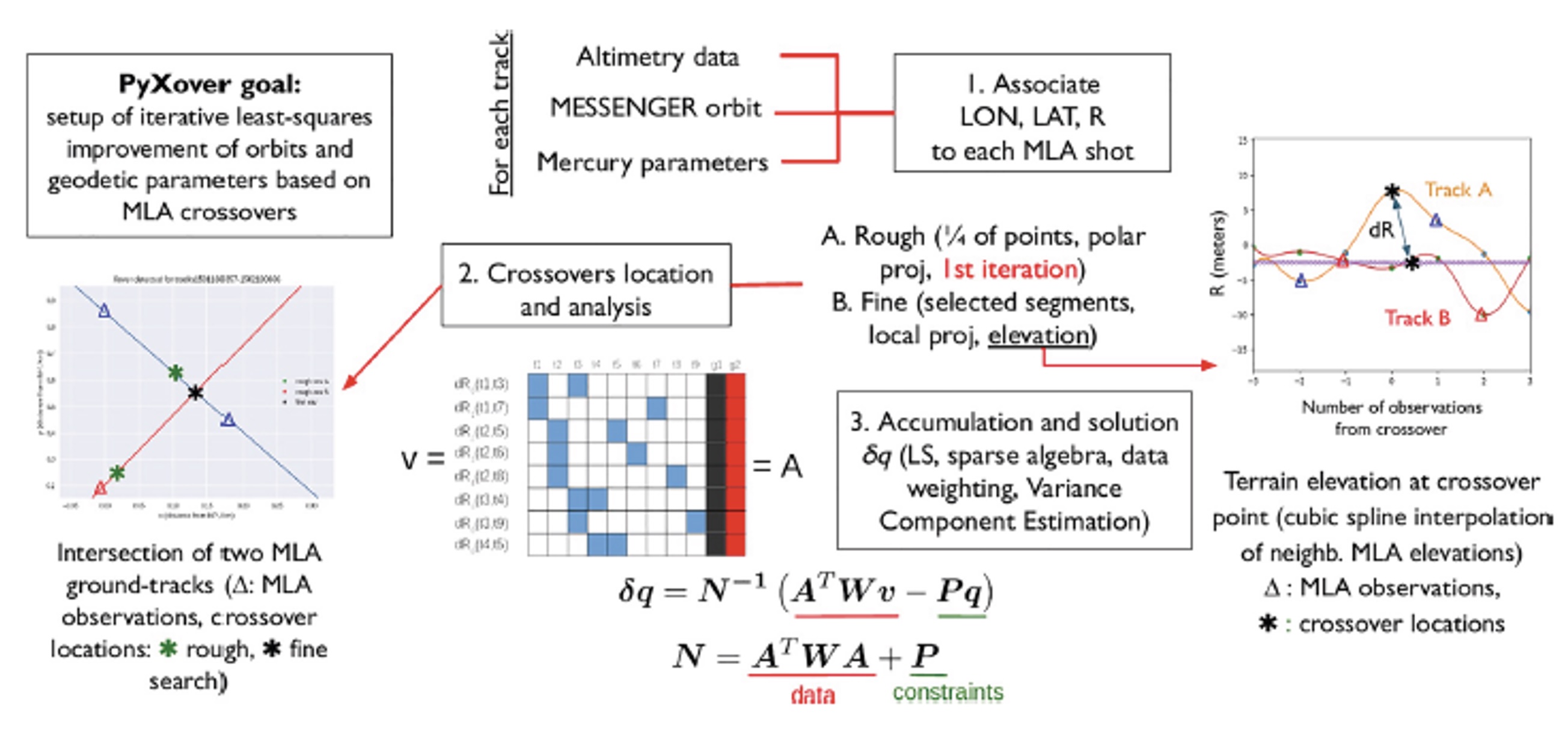 Figure 3. Workflow of the PyXover crossover-analysis software used to geolocate MLA measurements, identify crossovers, and solve simultaneously for orbit corrections and Mercury geodetic parameters.