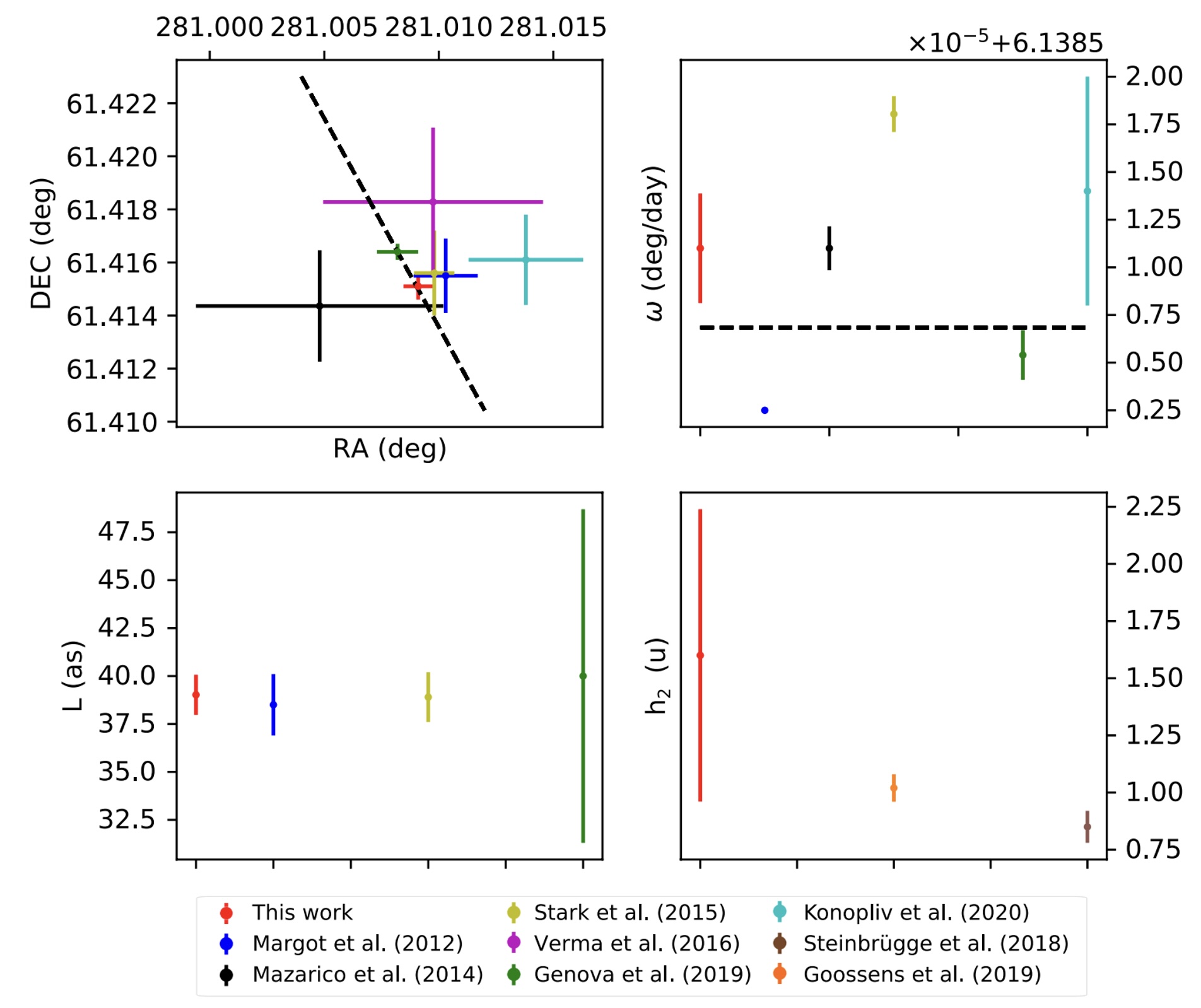 The final solution yields Mercury pole coordinates RA = 281.0093° and DEC = 61.4153°, spin rate ? = 6.138510°/day, libration amplitude L = 39.03 arcsec, and h2 = 1.55, as shown in Fig. 4. After calibration for systematic effects, the study reports that Mercury is consistent with a Cassini state and has an obliquity ? = 2.031 ± 0.03 arcmin. The inferred normalized polar moment of inertia is C/MR2 = 0.343 ± 0.006.
